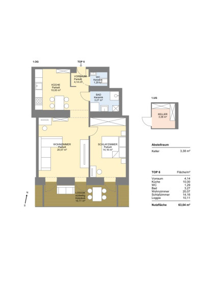 Parkett, Fliesen, Gas, Zentralheizung, Einbauküche, Personenaufzug, Südbalkon, Dusche