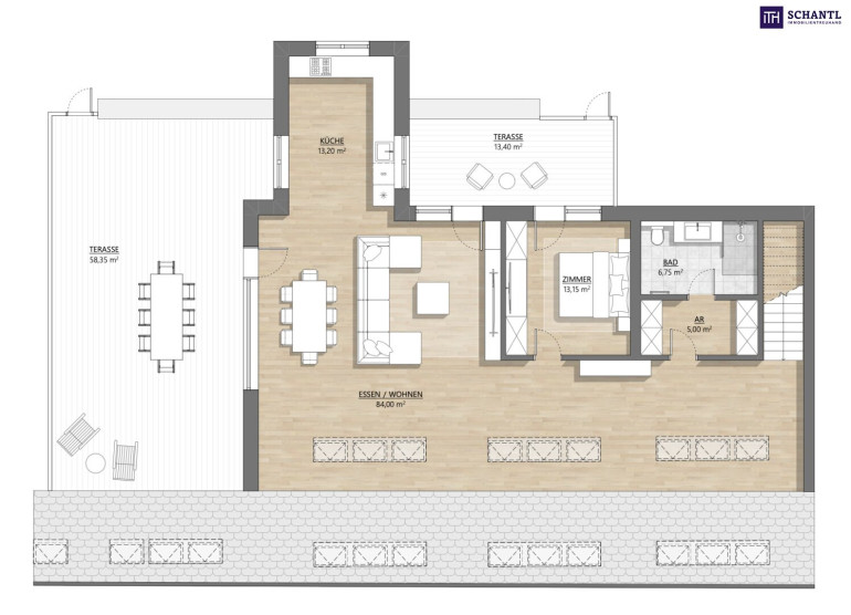 Ein besonderes Highlight sind die beiden Terrassen mit ca. 13 und ca. 58 Quadratmetern, die ein außergewöhnliches Freiraumangebot bieten und den Wohnbereich ideal erweitern – perfekt für Sonnenstunden, gesellige Abende oder entspannte Rückzugsorte über den Dächern der Stadt.