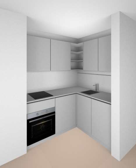 Jede Wohnung wird mit einer neuen, modernen Küche ausgestattet. Bei den derzeitigen Bildern handelt es sich um Visualisierungen, da die Küchen erst im April fertiggestellt werden.