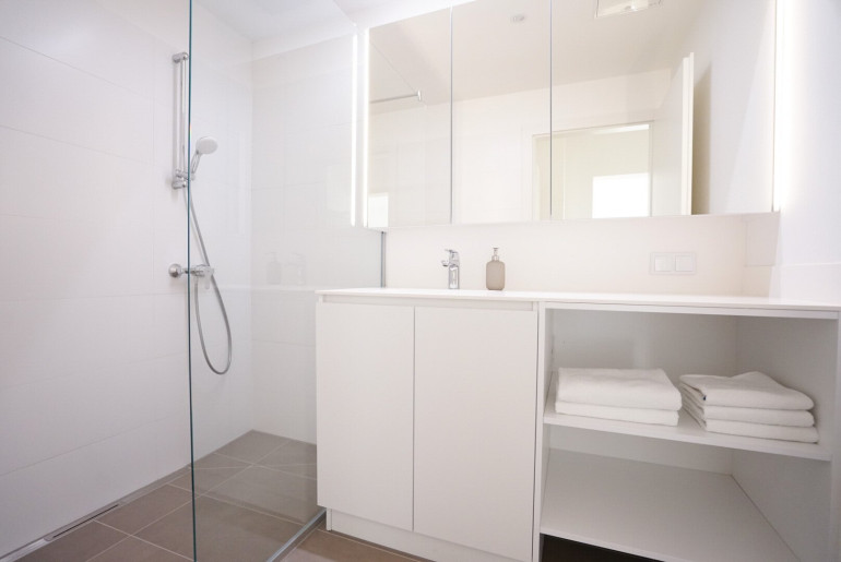 Die gesamte Ausstattung (Echtholzparkett, voll ausgestattete Einbauküchen, Badezimmer, Fußbodenheizung, Raumkühlung,...) präsentiert sich hochwertig!