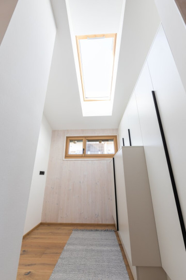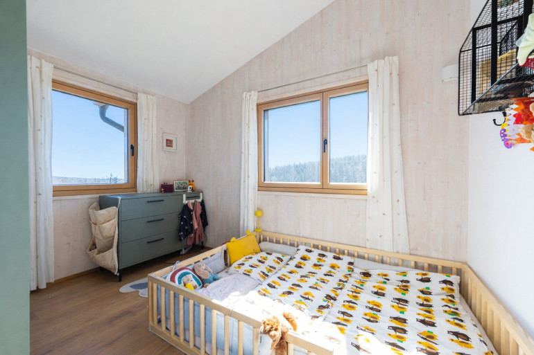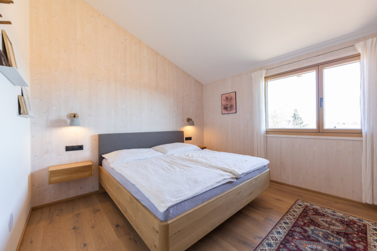 Die Kombination aus Ziegelmassivbau im Erdgeschoss und sichtbaren CLT-Massivholzwänden im Obergeschoss schafft ein außergewöhnlich angenehmes Raumklima.