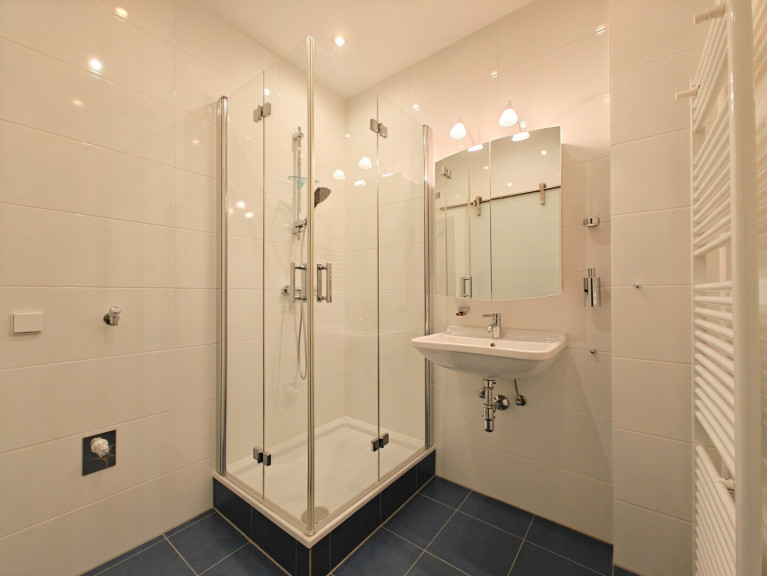 + Badezimmer mit Waschbecken, Dusche, Waschmaschinenanschluss und Sprossenheizkörper