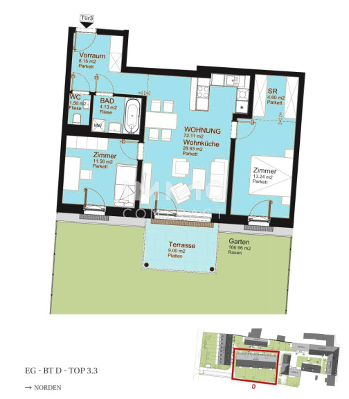 Alle Einheiten werden schlüsselfertig übergeben, inklusive hochwertiger Sanitäranlagen, Fliesen und Eichen-Parkettböden. Der Erwerb erfolgt provisionsfrei.