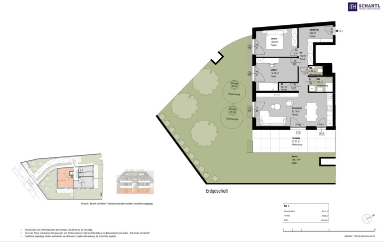 Wohnfläche: ca. 80,24m² + Terrasse: ca. 22,53m² + Eigengarten: ca. 138,154m² + Kellerabteil