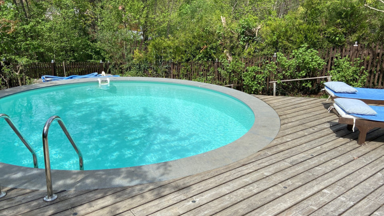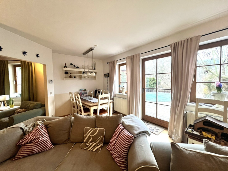 Das gegenständliche "Schmuckstück" wird von einem kleinen, aber feinen Garten mit großer Freiterrasse (mit Nachmittags- und Abendsonne) und einem einladenden Außenpool ergänzt und grenzt direkt an ein romantisches Bächlein.