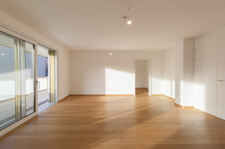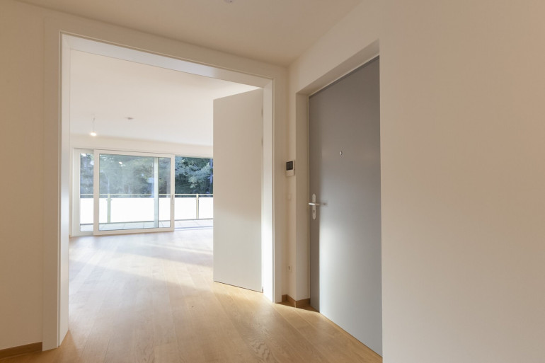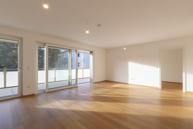 Es steht eine großzügige, westseitig ausgerichtete Terrasse ebenso zur Verfügung wie ein dieser Wohnung zugeordneter Eigengarten, der Teil der Anlage ist.