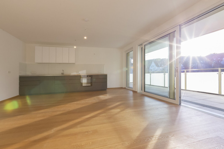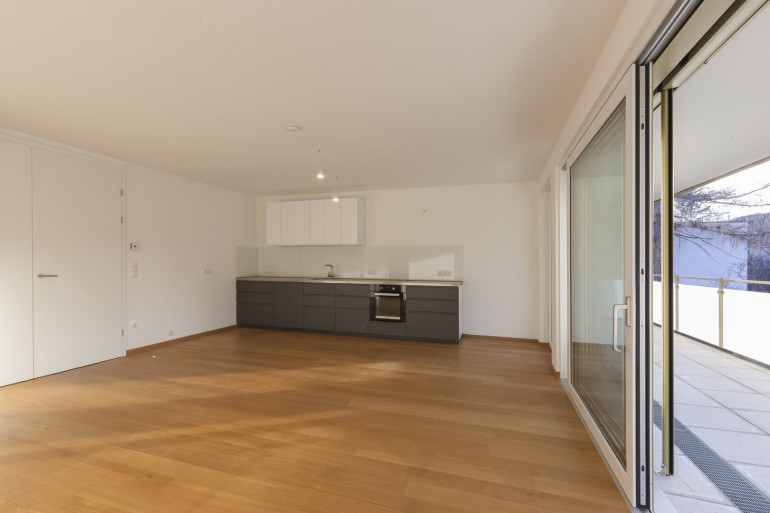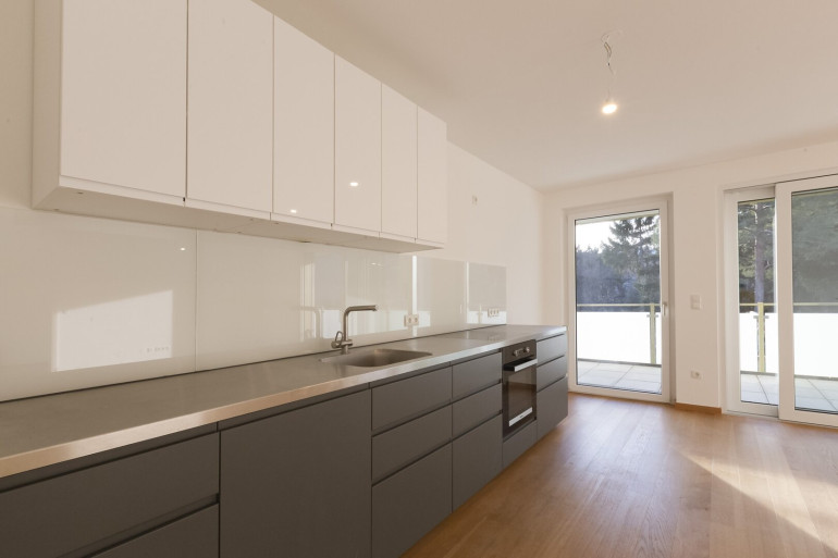 Teil des Kaufgegenstandes ist eine hochwertige Einbauküche mit Miele-Geräten. Der Wohnbereich wurde mit einer Doppelflügeltüre mit extrabreiten und hohen Türzargen sonderausgestattet.