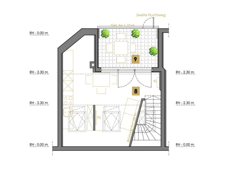 - Ebene 2: offene Wohnküche mit vorbereiteten Küchenanschlüssen für Einbauküche