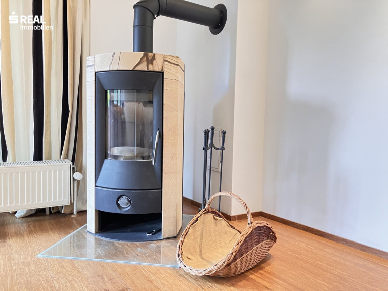 Das großzügige Wohnzimmer bildet das Herzstück der Wohnung und geht fließend in die offene Küche der Qualitätsmarke EWE über. Ein gemütlicher Schwedenofen sorgt hier zusätzlich für eine besonders behagliche Atmosphäre.