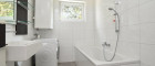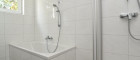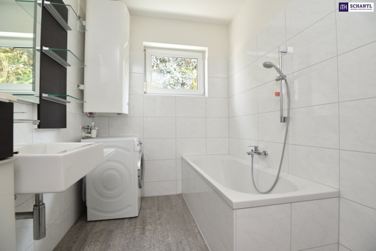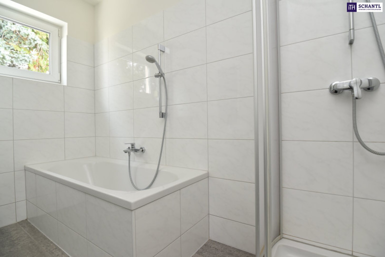 - helles Badezimmer mit Fenster, Dusche, Badewanne & Waschmaschinenanschluss