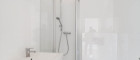 - Badezimmer mit Dusche, Waschbecken, Waschmaschinenanschluss und Toilette