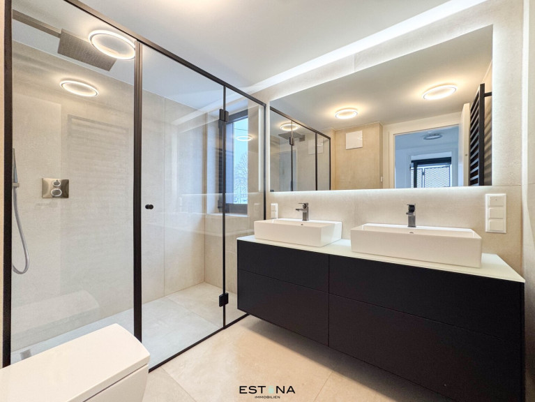 - Badezimmer mit Walk-In Dusche, Doppelwaschbecken und Toilette