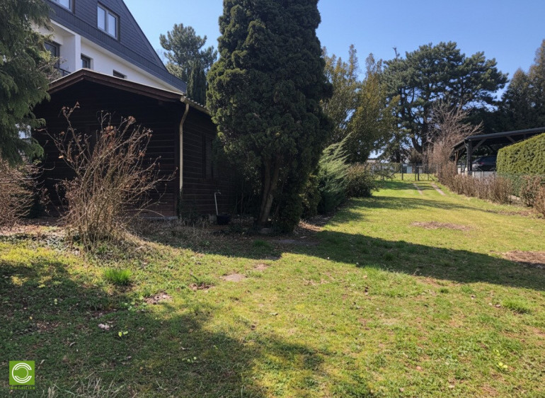 Die vordere Baufluchtlinie befindet sich bei 3 Meter, die hintere Baufluchtlinie bei ca. 34 Meter, jeweils von der Straßenfront gerechnet. Auf dem Grundstück befinden sich eine Gartenhütte aus Holz sowie ein hübscher Altbaumbestand. Das gesamte Grundstück ist eingezäunt und verfügt auch über einen Wasseranschluss. Am unteren Ende des Grundstücks gibt es einen zusätzlichen Ausgang auf einen Gehweg, dahinter befindet sich die Lärmschutzwand zur A21.