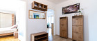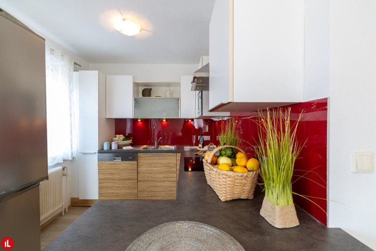 Der Wohnbereich ist hell und offen gestaltet und bietet direkten Zugang zur Terrasse. Die Küche ist mit einer Einbauküche ausgestattet.