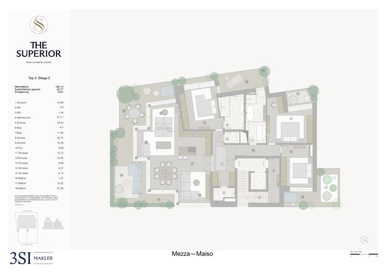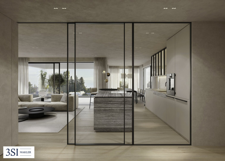 Im Zusammenspiel klarer Linien und präzise gesetzter Details entsteht die architektonische Qualität von THE SUPERIOR. Jede Entscheidung folgt einem übergeordneten Prinzip: Reduktion, Dauerhaftigkeit und Materialität. Die Innenräume überzeugen durch sorgfältig ausgewählte Oberflächen, die Ruhe ausstrahlen und zugleich Tiefe entwickeln. Eichenparkett bringt natürliche Wärme in die Räume, während großformatige Verglasungen Licht und Weitblick selbstverständlich integrieren. Auch in den Bädern setzt sich diese Klarheit fort. Hochwertiges Feinsteinzeug trifft auf fein ausgeführte Sanitärobjekte und schafft eine Atmosphäre, die zurückhaltend und zugleich anspruchsvoll wirkt. Technik versteht sich hier als diskrete Unterstützung. Split-Kühlgeräte sorgen für angenehme Temperaturen, ohne in Erscheinung zu treten. Elektrisch gesteuerte Beschattungselemente regulieren Licht und Atmosphäre im Hintergrund, während die Video-Gegensprechanlage Sicherheit und Privatsphäre gewährleistet.
