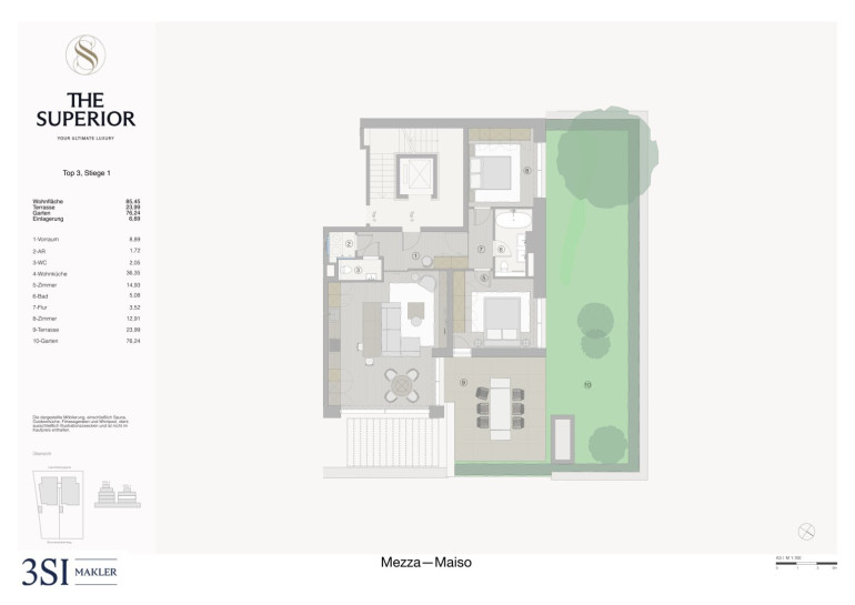 Großzügige Verglasungen sorgen für lichtdurchflutete Räume und schaffen eine angenehme Wohnatmosphäre. Der Wohnbereich bietet direkten Zugang zur Terrasse mit ca. 23,99 m², die in den Privatgarten mit rund 76,24 m² übergeht und zusätzlichen Freiraum im Grünen bietet.