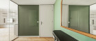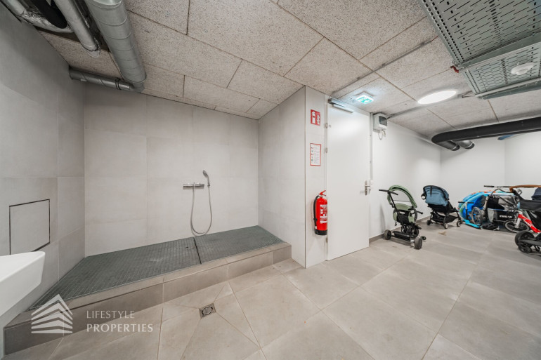 Die Regelung der Fußbodenheizung in den Aufenthaltsräumen (Zimmer, Wohnzimmer) und im Bad erfolgt über digitale Einzelraumregler mit Raumthermostat (d.h. jeder dieser Räume hat einen eigenen Raumregler). Die restlichen Räume (WC, Vorraum) sind mechanisch voreingestellt. Eine Stützkühlung ist über die Fußbodenfläche der Räume zur Fußbodenentwärmung vorgesehen und erfolgt über die Leitungen der Fußbodenheizung. Die Umschaltung zwischen Heiz- und Kühlbetrieb erfolgt manuell. Zudem gibt es einen hauseigenen Fitnessbereich, Kinderwagenraum, Fahrradabstellraum und ein Grünbereich im hinteren Teil des Hauses.