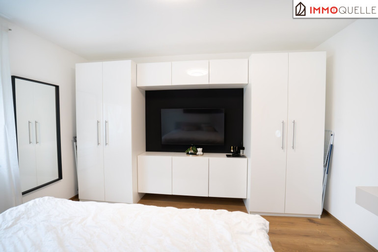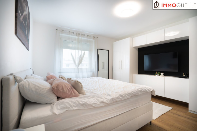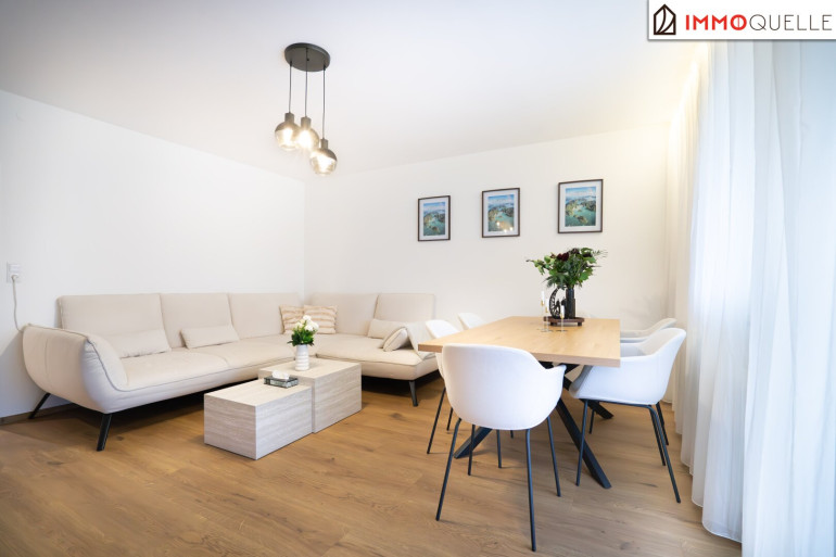 Das Herzstück der Wohnung bildet das großzügige Wohnzimmer. Dieser Raum lädt zum Verweilen ein und wird schnell zum Mittelpunkt des täglichen Lebens. Hier können Sie entspannte Abende verbringen, Gäste empfangen oder einfach die gemütliche Atmosphäre Ihres Zuhauses genießen. Vom Wohnzimmer aus gelangt man direkt auf die südlich ausgerichtete Loggia, die einen angenehmen Platz zum Verweilen bietet. Hier lässt sich die Sonne genießen und der Tag in ruhiger und entspannter Umgebung ausklingen.