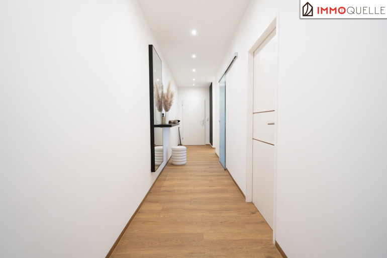 Schon beim Betreten der Wohnung empfängt Sie ein einladender Flur, der die Räume harmonisch miteinander verbindet und einen ersten Eindruck der gelungenen Aufteilung vermittelt. Auf der linken Seite des Flurs befindet sich zunächst die Küche. Durch die Fenster wirkt der Raum besonders hell und freundlich und schafft eine gemütliche Atmosphäre zum Kochen und Verweilen.