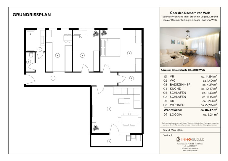 Lage? Die Wohnung befindet sich in der Billrothstraße 115 in Wels in einer ruhigen Wohngegend mit guter Infrastruktur. Einkaufsmöglichkeiten, Apotheken und Ärzte sind in wenigen Minuten erreichbar. Auch Freizeitmöglichkeiten und Grünflächen befinden sich in der Nähe und bieten Platz für Erholung und Aktivitäten. Die Lage verbindet eine angenehme Wohnatmosphäre mit kurzen Wegen im Alltag.