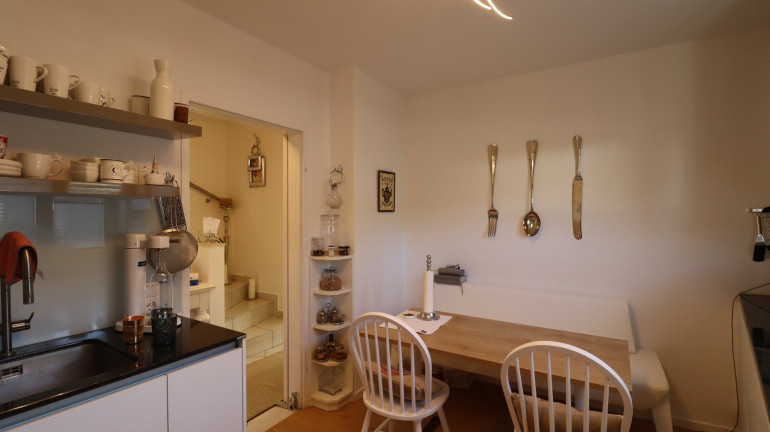 Die angrenzende Küche ist modern und funktional ausgestattet und bietet ausreichend Platz für die Zubereitung von köstlichen Mahlzeiten. Ein besonderes Highlight ist der direkte Zugang zum Garten, wo Sie gemütliche Sommertage im Freien genießen können. Der Garten ist perfekt für Grillabende mit Freunden oder zum Spielen mit Kindern geeignet.