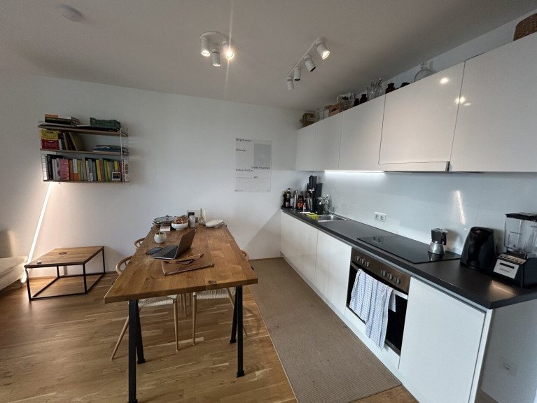 Linker Hand öffnet sich die großzügige Wohnküche mit ausreichend Platz für Wohn- und Essbereich. Von hier aus gelangen Sie direkt auf den Balkon mit Blick in den ruhigen Innenhof, der den Wohnraum angenehm erweitert und zum Entspannen im Freien einlädt.