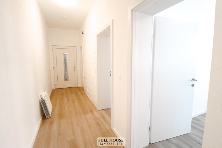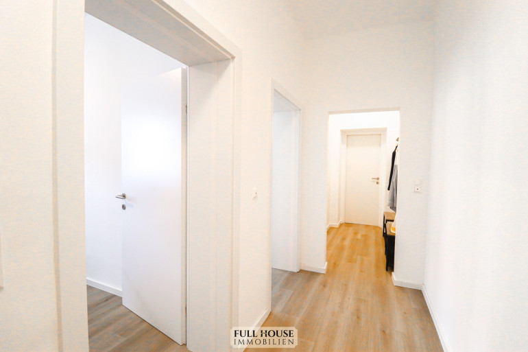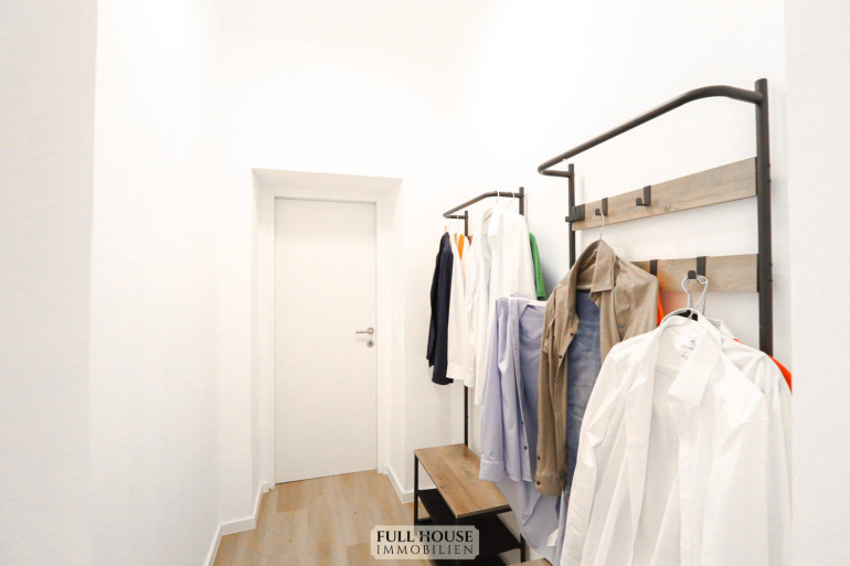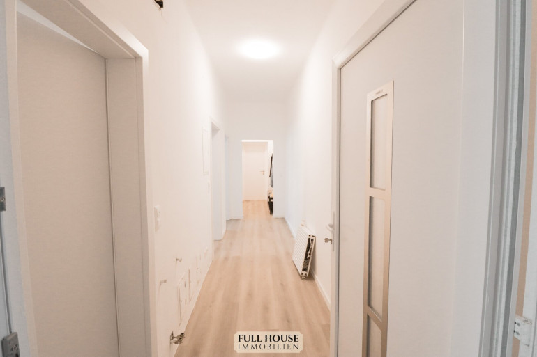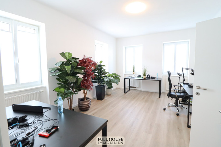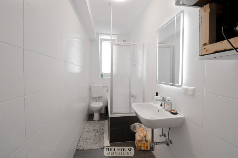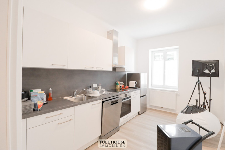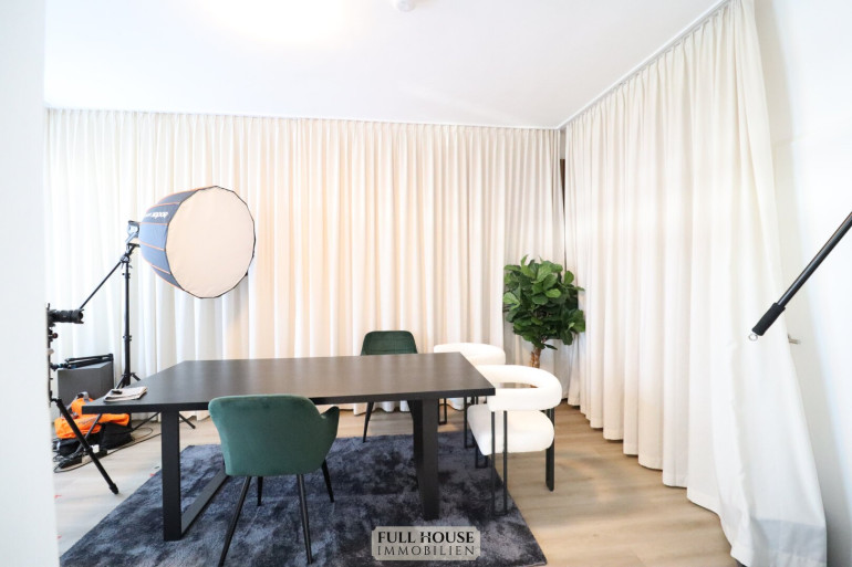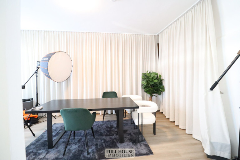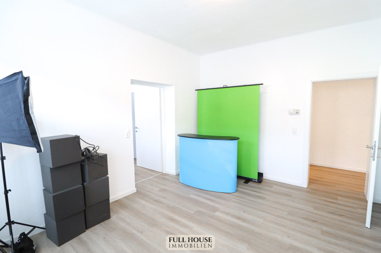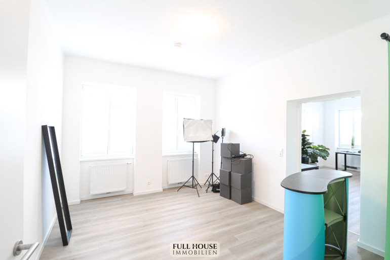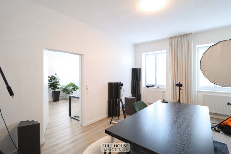 Beim Betreten gelangt man zunächst in einen geräumigen Vorraum, der zentral alle Räume miteinander verbindet. Links befindet sich das neue Badezimmer mit Fenster, Badewanne, WC sowie hellen, großformatigen Fliesen. Gegenüber liegt ein praktischer Abstellraum, der zusätzlichen Stauraum bietet. Geradeaus öffnet sich der großzügige Wohn- und Arbeitsbereich, der aktuell als Videostudio genutzt wird. Die klar strukturierte Raumaufteilung bietet vielfältige Nutzungsmöglichkeiten – sei es als klassisches Wohnzimmer oder als Kombination aus Wohnen und Homeoffice. Die neue, moderne Wohnküche ist separat begehbar, verfügt über ausreichend Stauraum, hochwertige Geräte und Platz für einen kleinen Essbereich.