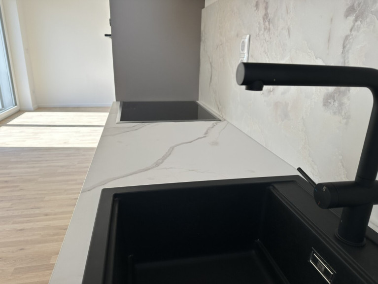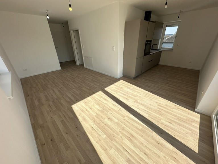 Laminatboden, Zentralheizung, Einbauküche, Wohnküche / offene Küche, Personenaufzug, Südbalkon, Dusche, Parkplatz