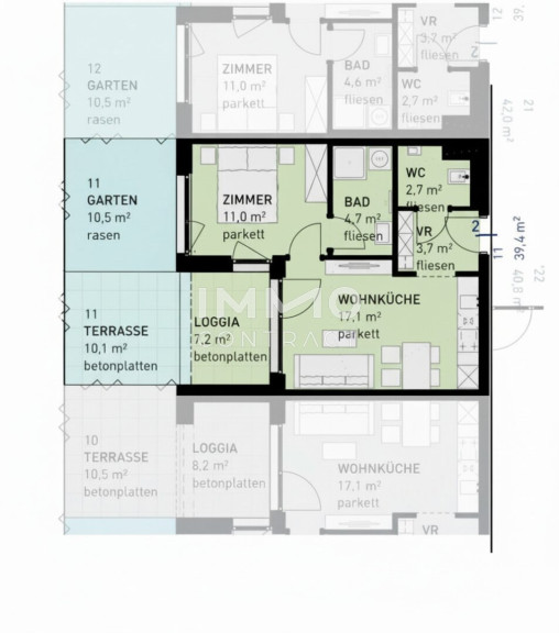- Jede Wohnung mit privater Freifläche (Loggia, Balkon, Terrasse, Eigengarten)