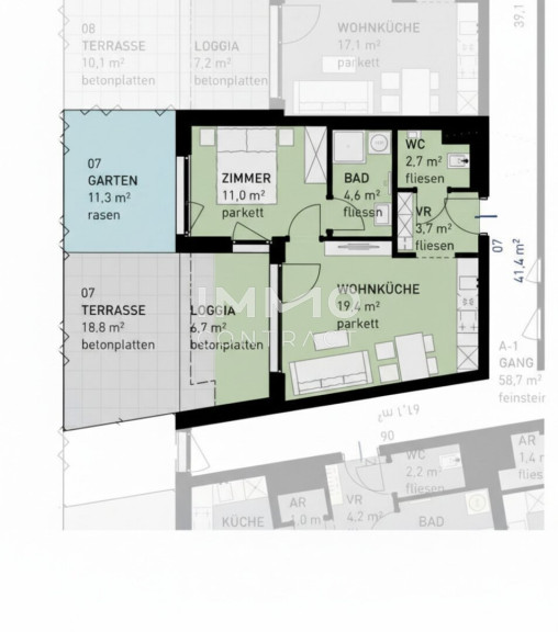- Jede Wohnung mit privater Freifläche (Loggia, Balkon, Terrasse, Eigengarten)