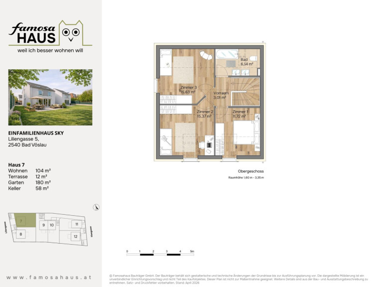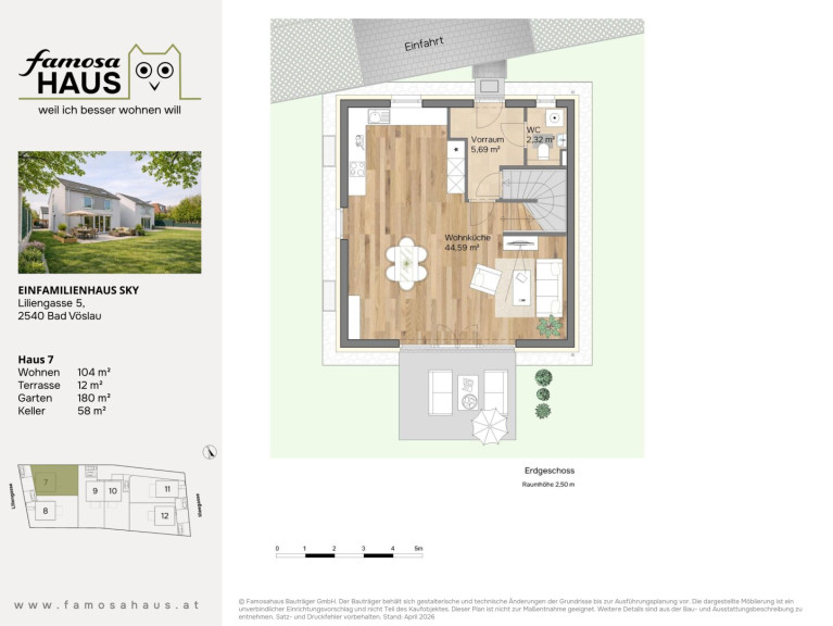 Die dargestellten Schaubilder wurden teilweise digital bearbeitet bzw. mithilfe künstlicher Intelligenz visualisiert. Sie dienen ausschließlich der beispielhaften Darstellung von Einrichtungs- und Gestaltungsmöglichkeiten und stellen keinen verbindlichen Ausführungs- oder Lieferumfang dar. Maßgeblich für die tatsächliche Ausführung sind ausschließlich die vertraglichen Vereinbarungen, Bau- und Ausstattungsbeschreibungen sowie die genehmigten Pläne. Abweichungen in Ausstattung, Materialien, Farben, Möblierung oder Bepflanzung sind möglich.