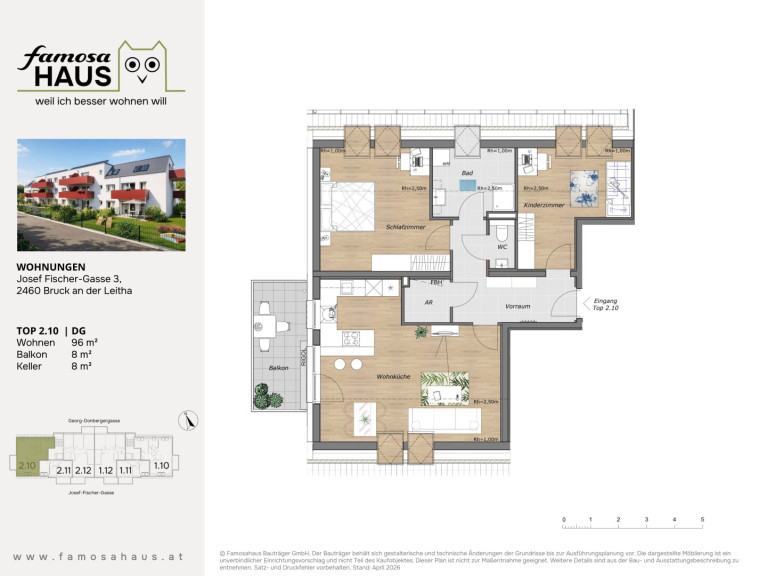 Die Wohnung Top 2.10 ist eine großzügige, lichtdurchflutete 3-Zimmer-Wohnung mit spürbar viel Raum und einem besonders angenehmen Wohngefühl. Auf rund 96 m² Wohnfläche bietet sie eine klare Aufteilung – ideal für Familien, Paare mit Platzbedarf oder Home-Office-Nutzung.