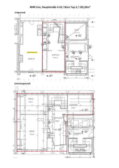 Die Gesamtfläche von 192,20 m² teilt sich auf auf ca. 46 m² im EG und ca. 146 m² im 1.OG - eine interne Treppe verbindet die beiden Etagen, sodaß Sie ungestört von einer Ebene zur anderen gelangen.