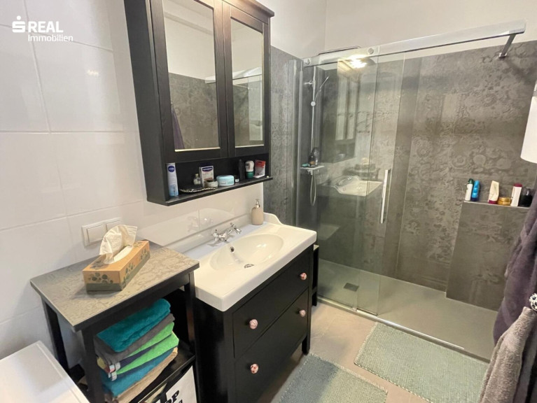 Untergeschoss: Vorraum, separates WC, geräumige Küche mit Essbereich, Wohnzimmer, Schlafzimmer, Arbeitszimmer, Bad mit begehbarer Duche und Terrasse mit Markise(ca. 18m²)