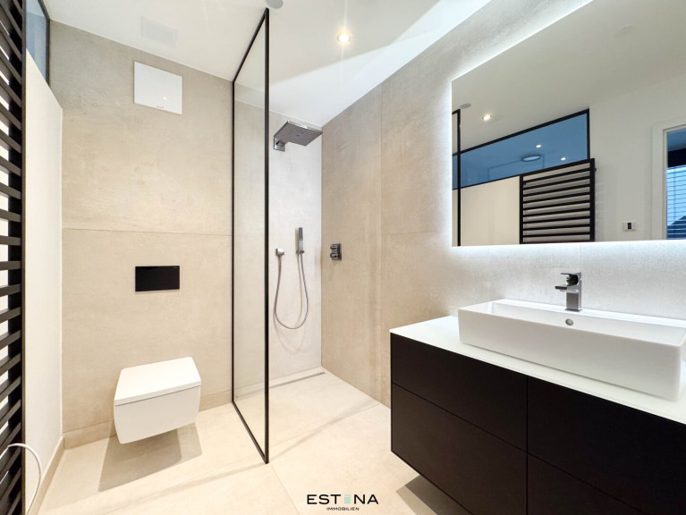 - Badezimmer mit Walk-In Dusche, Doppelwaschbecken und Toilette