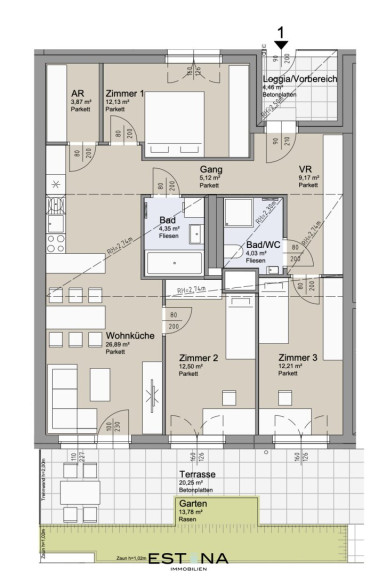 Fliesen, Parkett, Wohnküche / offene Küche, Westbalkon, Badewanne, Dusche, Tiefgarage