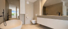 1 exquisites Badezimmer mit offener Glasdusche, Badewanne, Doppelwaschtisch und WC