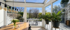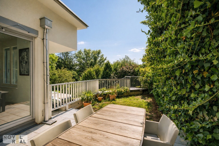 Die großzügige Terrasse bietet einen gemütlichen Sitzbereich, der sich perfekt zum Sonnenbaden und Genießen sonniger Tage eignet, während der Garten einen grünen Loungebereich und einen idyllischen Rückzugsort im Freien bietet.