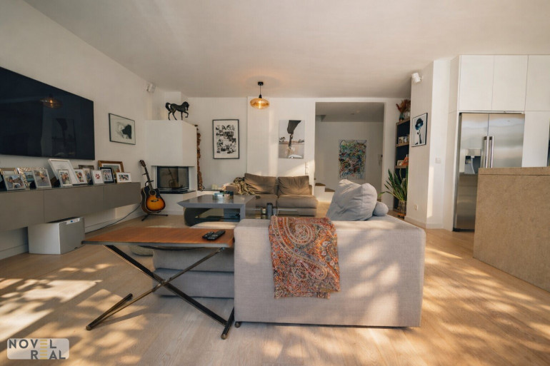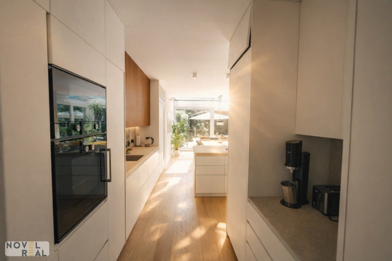 Die exklusive offene Designerküche, entworfen von renommierten Architekten, bietet edle Eleganz und hohe Funktionalität. Ausgestattet mit hochwertigen Geräten (Gaggenau) ist sie ein Highlight des Zuhauses und ein Traum für Hobbyköche und Profis. Der offene Kamin im Wohnbereich verspricht gemütliche Abende.