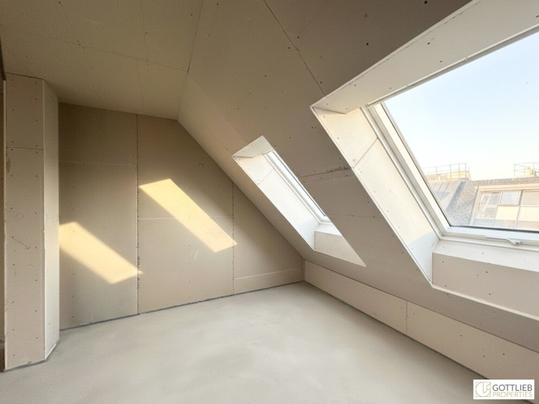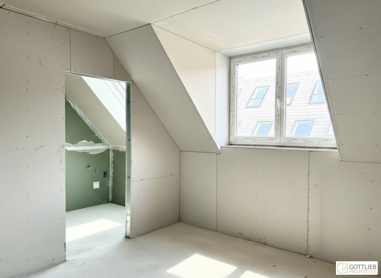 Der Ausbau des dritten Obergeschosses sowie der beiden Dachgeschosse erfolgte zeitgleich mit der Generalsanierung des gesamten Gebäudes. Der Innenausbau wird in Kürze fertiggestellt und die Wohnungen werden schlüsselfertig übergeben.