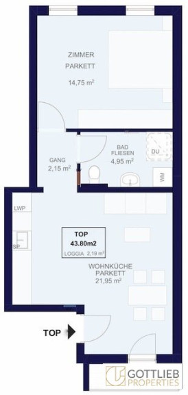 Man betritt die Wohnung und gelangt direkt in die gemütliche ca. 21,95 m² große Wohnküche mit Ausgang auf den Balkon, weiters über einen Gang in das Schlafzimmer mit ca. 14,75 m² Größe sowie in das ca. 4,95 m² große Duschbad mit Toilette.
