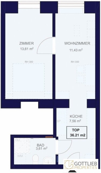Man betritt die Wohnung und gelangt unmittelbar in die gemütliche ca. 7,56 m² große Wohnküche, das ca. 3,61 m² große Duschbad mit Toilette sowie in den Wohn-Ess-Bereich mit ca. 11,43 m² und das Schlafzimmer mit ca. 13,61 m² Größe.