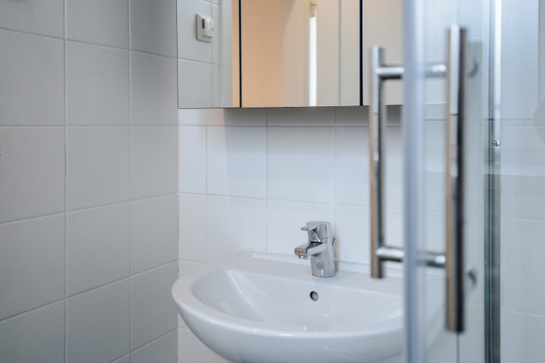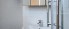 Die Glas-Schiebetür offenbart eine vollausgestattete, moderne Küche, die nicht nur durch ihre Ausstattung, sondern auch durch die optimale Beleuchtung und die gemütlichen Sitz- und Essmöglichkeiten überzeugt. Hier werden Kochen und gesellige Abende zum wahren Vergnügen. Das elegante Badezimmer mit Eckdusche, Waschbecken mit Spiegelschrank und einem praktischen Waschmaschinenanschluss fügt sich nahtlos in das moderne Gesamtbild ein.