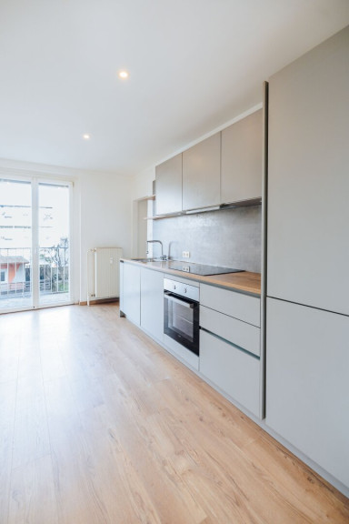 Schon beim Betreten der Wohnung empfängt Sie ein freundlicher, geräumiger Vorraum, der mit seinem modernen Bodenbelag sofort ein Gefühl von Wärme und Behaglichkeit vermittelt. - Voll ausgestattete Küche mit Balkonzugang