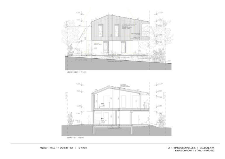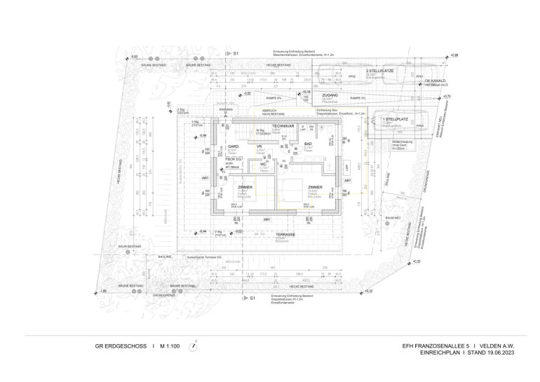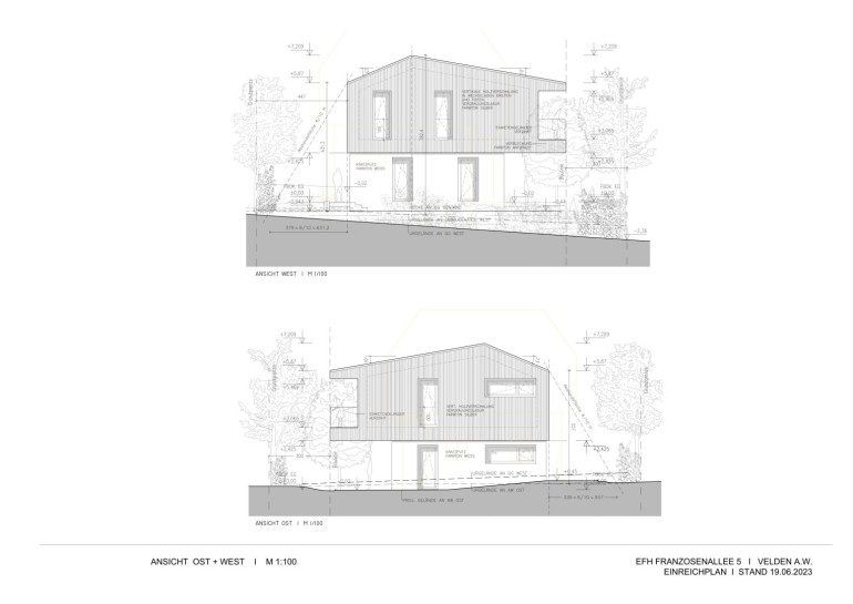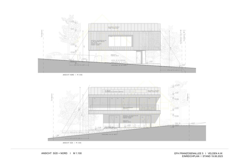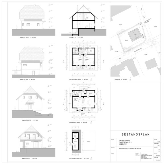 Der bestehende Gebäudebestand umfasst mehrere Ebenen mit Untergeschoss, Erdgeschoss und Obergeschoss. Die Planunterlagen zeigen ein Einfamilienhaus mit den entsprechenden Grundrissen, Ansichten sowie einem Lageplan des Grundstücks.