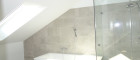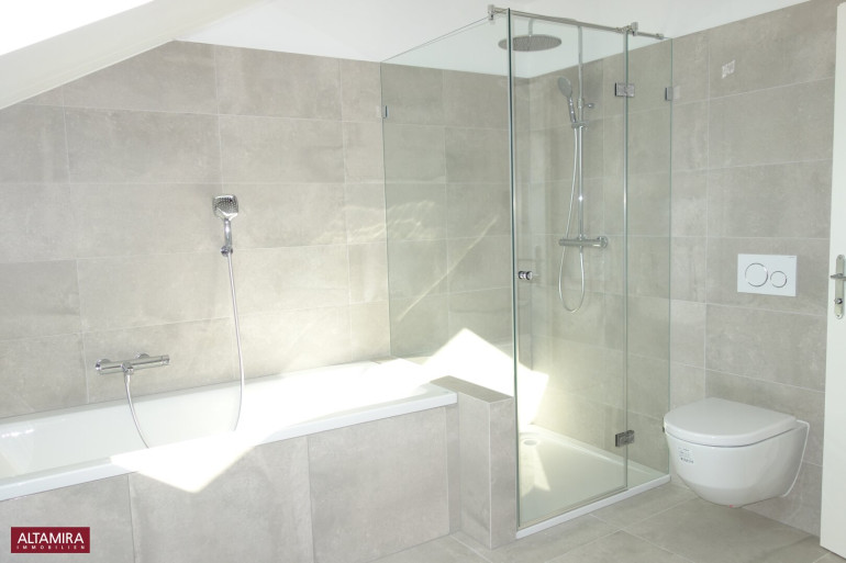Im Dachgeschoß befindet sich das große Badezimmer komplett mit Badewanne und Dusche, sowie WC und ein Dachflächenfenster.