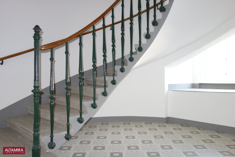 Die Innenstiege ist mit hochwertigem Eichen Parkett belegt und der Fußboden ist mit hochwertigem Fischgrätparkettboden belegt.