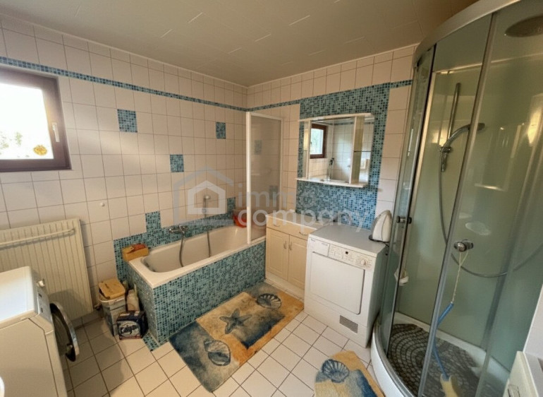 - Badezimmer mit Dusche, Wanne, Waschbecken, Fenster und Waschmaschinenanschluss