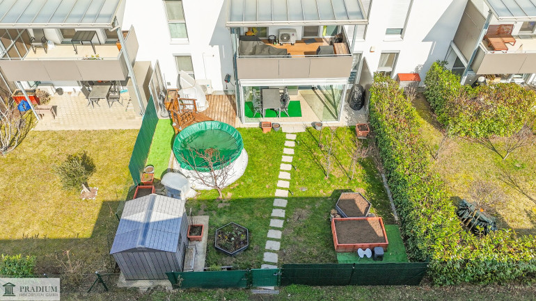 Ein besonderes Highlight ist der private Garten mit rund 85 m², der viel Platz zum Entspannen, Gärtnern oder für Hundeauslauf direkt vor der eigenen Wohnung bietet. Die westseitige Terrasse lädt besonders am Nachmittag und Abend zum Verweilen ein.