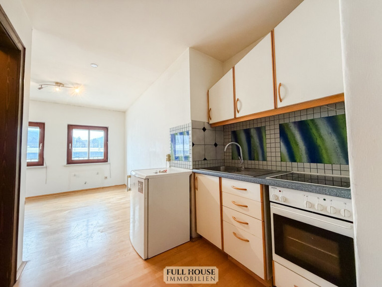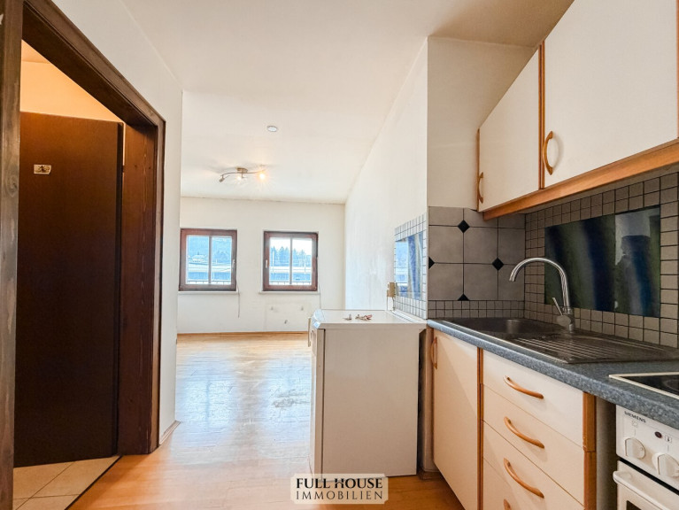 Geradeaus öffnet sich die Wohnküche mit ca. 14,43 m², die ausreichend Platz für Kochen, Essen und Wohnen bietet. Der Küchenbereich befindet sich auf der rechten Seite, während im vorderen Bereich genügend Raum für einen Ess- sowie Wohnbereich vorhanden ist.